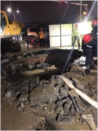 不到10分鐘,應(yīng)急搶修隊(duì)員迅速到達(dá)南湖廣場?,F(xiàn)場發(fā)現(xiàn)有大量泥沙被水沖出,這說明漏水點(diǎn)附近地基可能已被水流淘空。為防止發(fā)生人員安全事故,搶修人員冒著大雨站在現(xiàn)場,提醒過往車輛和行人繞行。經(jīng)現(xiàn)場仔細(xì)勘查,搶修人員迅速制定維修方案,并投入到緊張的搶修工作。